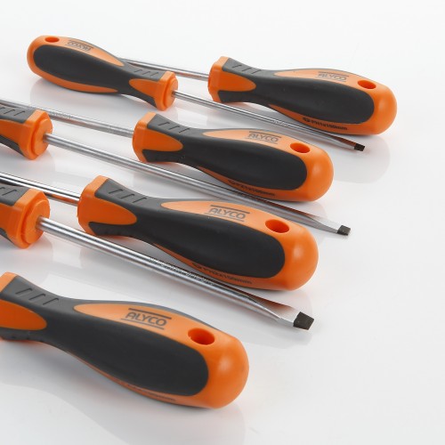 Destornillador de varilla cilíndrica con punta negra imantada y mango bimaterial ergonómico.